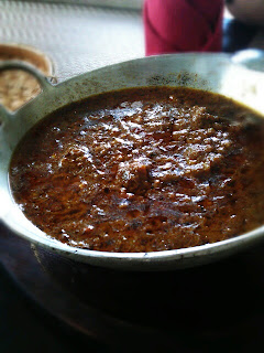 Karena saking banyaknya saya bingung dan langsung tanya aja ama pelayannya "Mas, saya pengen yang daging sapi, pakai bumbu kari India dan yang paling enak apa yah?". Langsung ditunjuk satu jenis hidangnya bernama "Korai Ghost beef", yaitu potongan daging sapi yang dimasak dengan bumbu Kari India disajikan dalam wajan. Ok! itu aja deh. Lauk-lauk ini bisa dimakan dengan nasi, basmati, paratha (roti khas India) dan chapati (roti khas India dengan bahan dasar gandum).